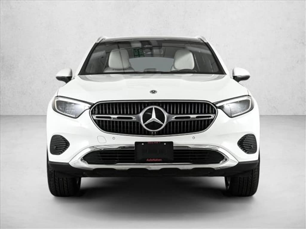 Certified 2025 X Loaner GLC300W4 All Wheel Drive in Polar White/Macchiato Beige MB-Tex with Panorama Sunroof, Heated Steering Wheel, Natural Grain Walnut Wood Trim & 18 5-Spoke Wheels