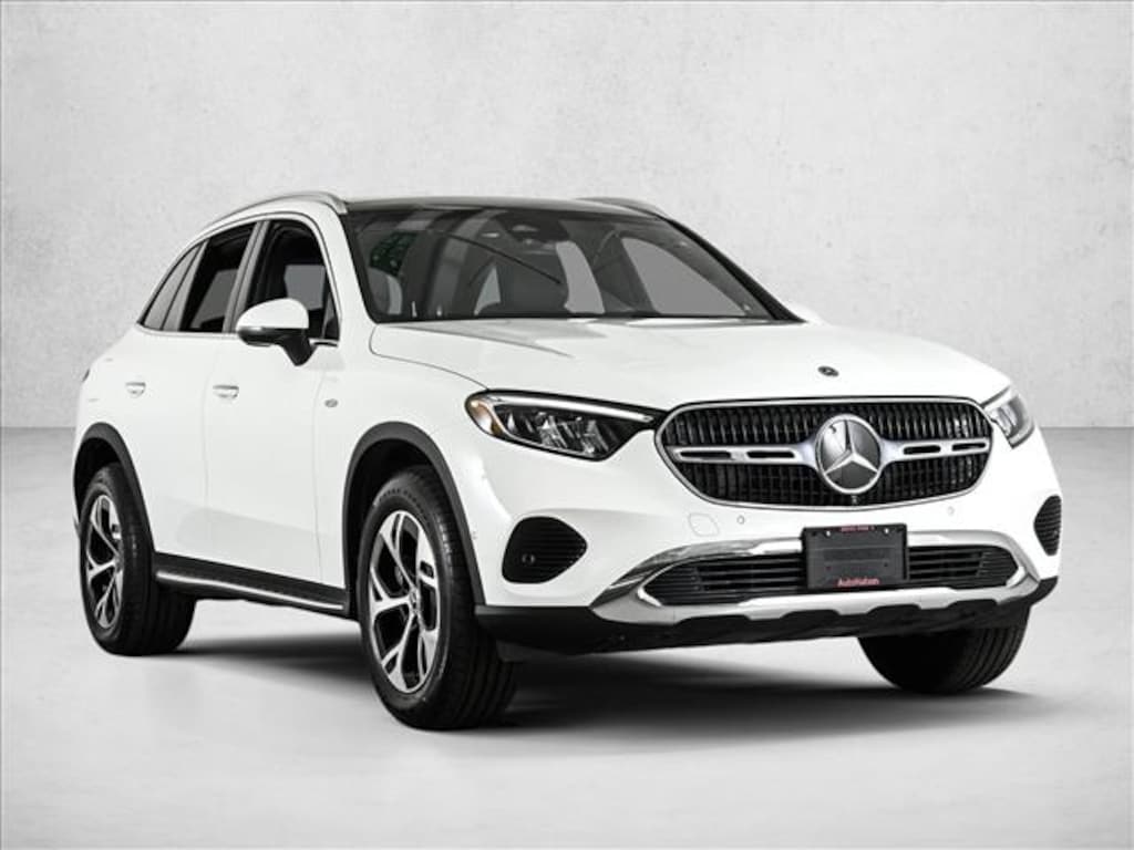 2025 Certified X Loaner GLC350E4 All Wheel Drive in Polar White/Black MB-Tex with Exclusive Line, Panorama Sunroof, Heated Steering Wheel, Enhanced USB Package, Aluminum-Look Running Boards with Rubber Studs, Load Sill Protector, Animated LED Logo Projector, Glossy Brown Ash Wood Trim & 18" 5-Spoke Wheels