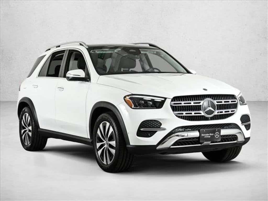 Certified 2025 X Loaner GLE350W4 All Wheel Drive in Polar White/Black MB-Tex with Exclusive Trim. Panorama Sunroof, Trailer Hitch, Winter Package, Natural Grain Brown Walnut Trim, Load Sill Protector & 20 Twin 5-Spoke Wheels