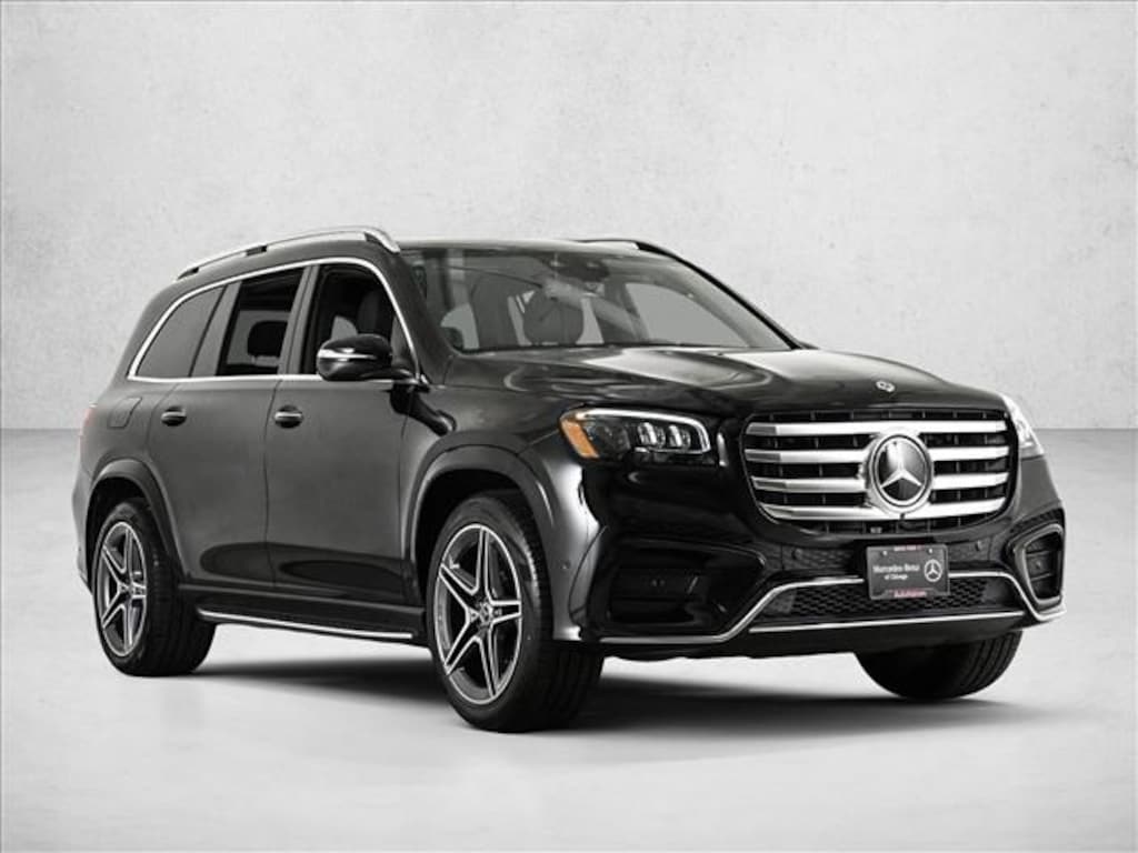 Certified 2025 X Loaner GLS450W4 All Wheel Drive Black/Black MB-Tex with 7 Seat Configuration, AMG Line Exterior Package, Power Rear-Side Window Sunshades, Trailer Hitch, Illuminated Brushed Aluminum Running Boards, Heated Rear Seats, MB-Tex Upper Dash And Door Trim, Load Sill Protector, Natural Grain Grey Oak Wood Trim & 21 AMG Twin 5-Spoke Wheels